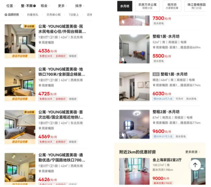每经记者在走访中发现,杨浦区“城置美宿”紧邻内环,步行至地铁站约10分钟,商业、教育、医疗等配套齐全。约42平方米一居租金约4600元/月,而临近的高层住宅水月坊,46平方米一居租金约6030元/月。